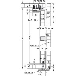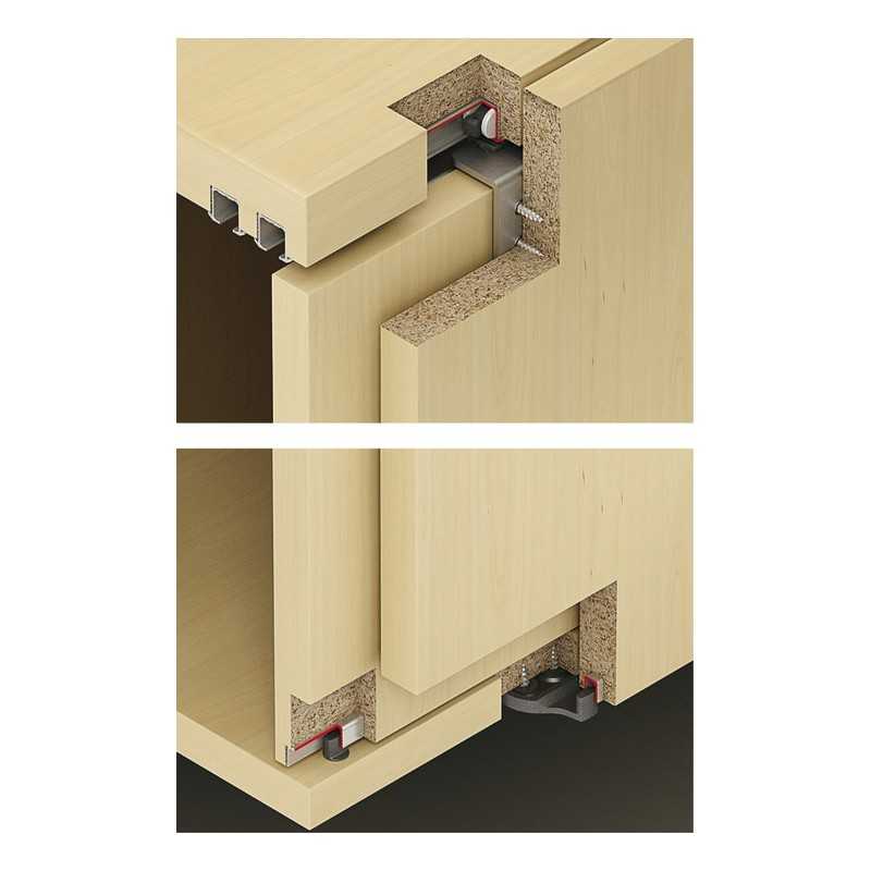 | Til 2 dør | Med clip-in dørstopper | 4 kørebeslag 1 styr 1 bundstyr 2 dørstopper med clip-in funktion 1 lågemedbringer |