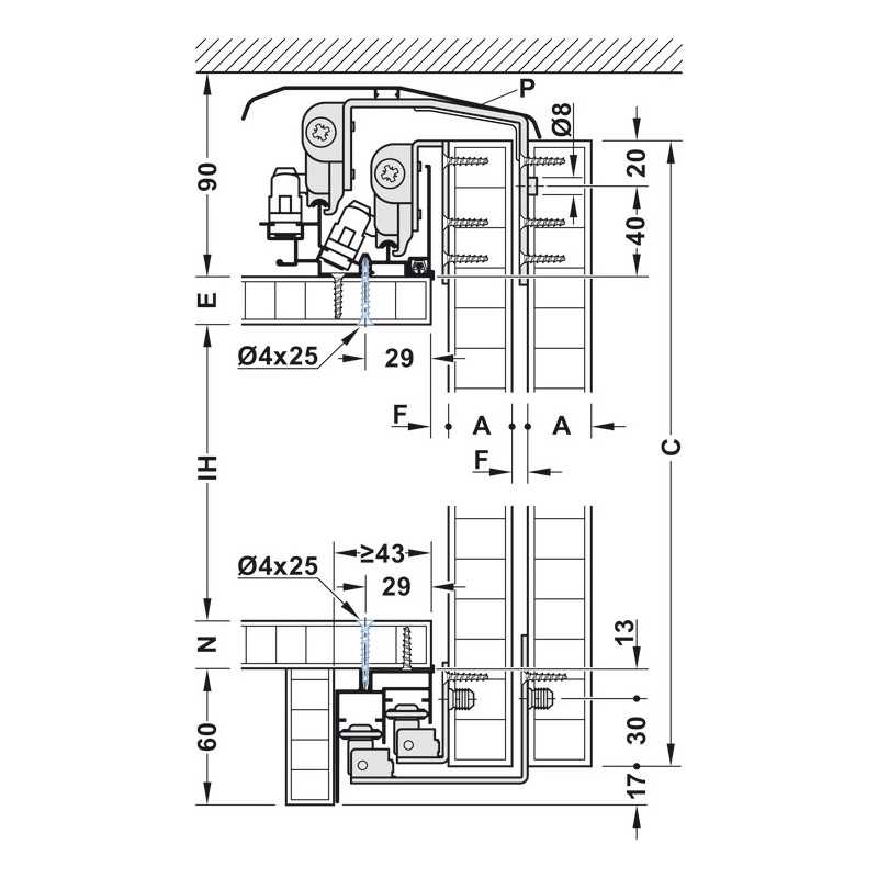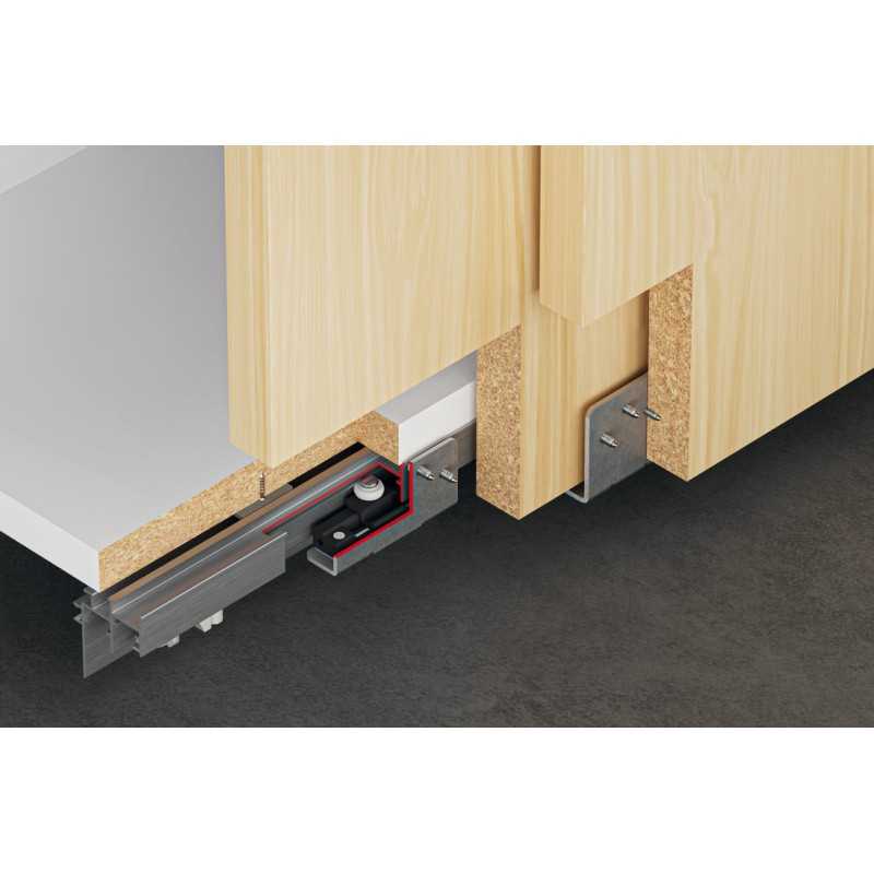 Häfele Slido F-Line44 80A er et elegant skydedørsbeslag til skabe med store heldækkende låger op til 80 kg.