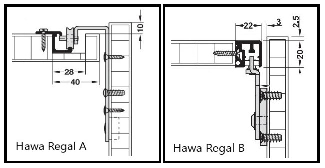 Forskellen på Hawa Regal A og BForskellen på Hawa Regal A og B er mest af alt montering og justeringsmetoden, som har betydning for hvor tæt og fluks lågen skal sidde på skabskorpus. Hawa Regal A er bedst egnet til brug hvor man ønsker flere låger i samme system, og funktion er vigtigere end udseende, da monteringsmetoden er mere anvendelig til dette. Hawa Regal B er bedst egnet til brug hvor lågen skal sidde mere tæt. Denne kan også bruges til at sammensætte flere låger, men siden monteringen sidder mere tæt end Regal A, er monteringen end smule mere kompliceret.