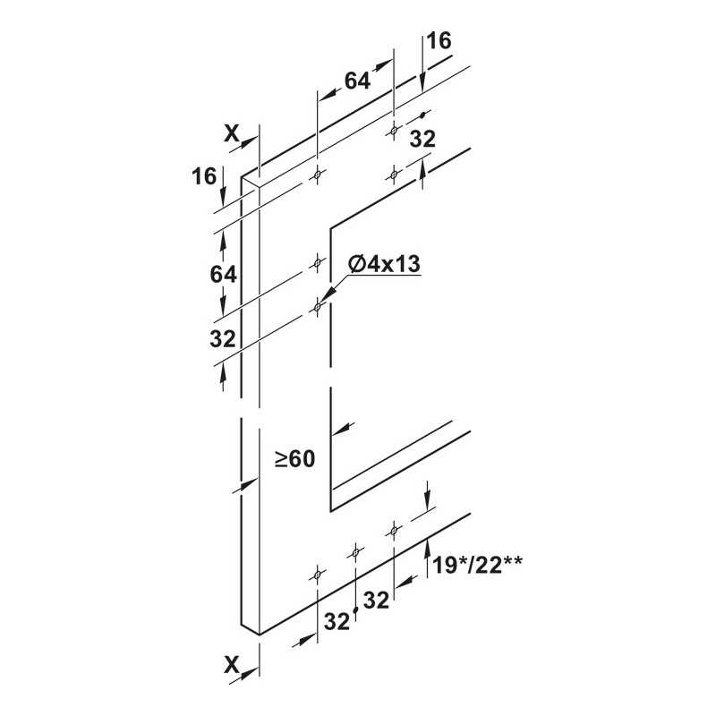• E = Skabets toppanels tykkelse (16 eller 19 mm)