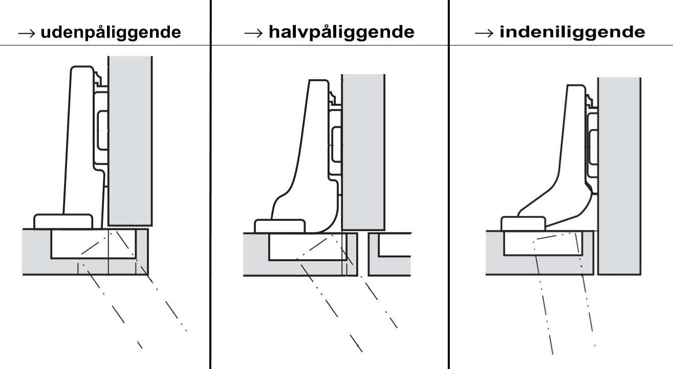Som standard findes der tre typer hængsler: udenpåliggende, halvpåliggende og indeniliggende. Det handler i bund og grund om, hvordan du vil have skabslågen skal sidde; om skabslågen skal dække hele fronten af skabskorpus (udenpåliggende) eller skal lågen sidde inde i skabet (indeniliggende)?