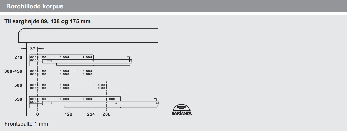 Eksempel: Med en sarghøjde på 89 mm, skal der minimum være 112 mm i højden (som vist på illustration) for at der er plads til skuffen.