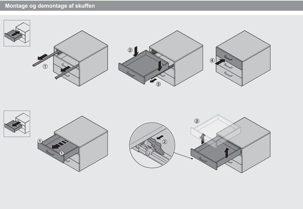 Nedenstående billede viser hvordan skuffen monteres på udtrækket, samt hvordan skuffen afmonteres af skuffeudtrækket. Monteringen er ganske let, skuffen skal blot klikkes på og af udtrækket med de smarte koblingsbeslag.