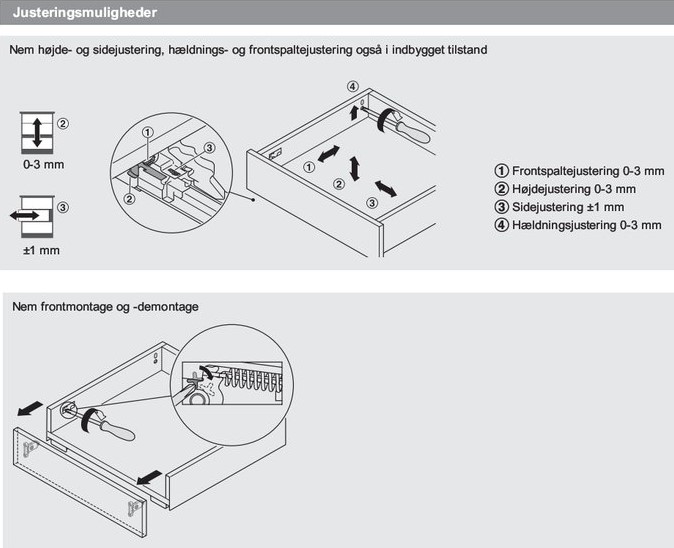 Når du har lavet skuffen færdig og montereret den på udtrækket i skabet, så har du en række muligheder for at justere skuffen. Disse vil blive vist herunder: