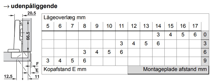 Du kan læse meget mere om hvordan du finder det rigtige type hængsel og hvordan du finder afstanden på din montageplade her: Vejledning i hængsler
