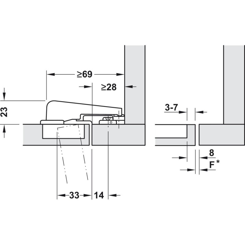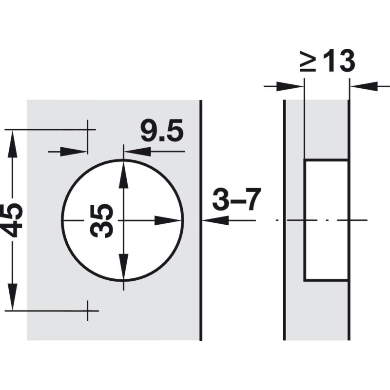 Dette hængsel passer til Blum montageplader. Montageplade skal købes ved siden af. Til dette hængsel passer kun denne montageplade