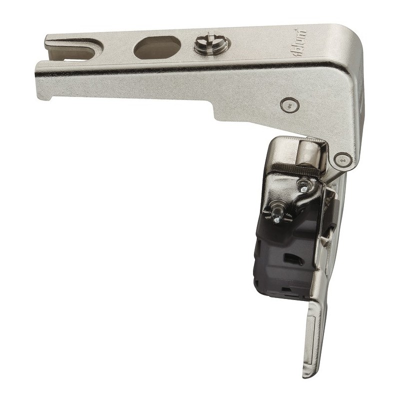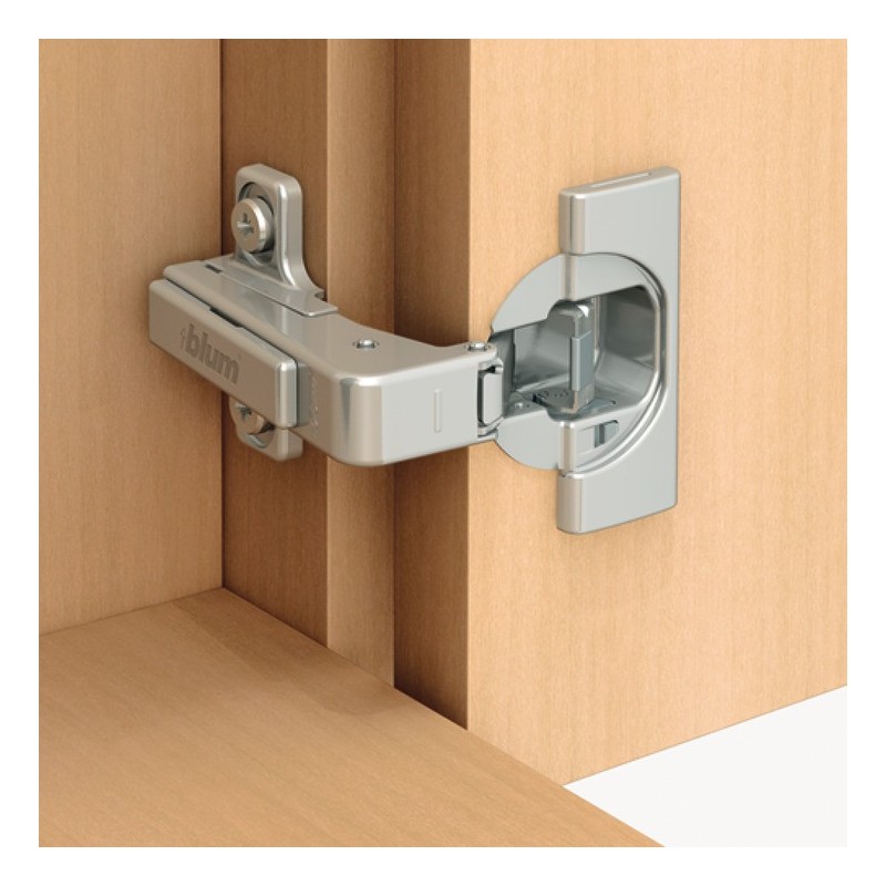 Blum Clip Top Blumotion kophængsel med en åbning på 95 grader til smalle stolleanvendelser, er brugt i skabe hvor hængslet sidder plan med lågen i lukket position.