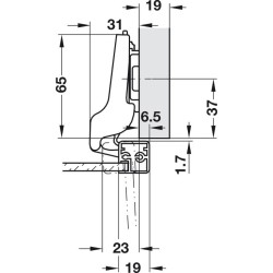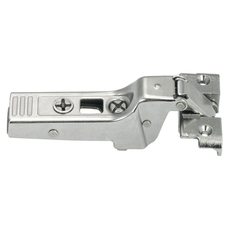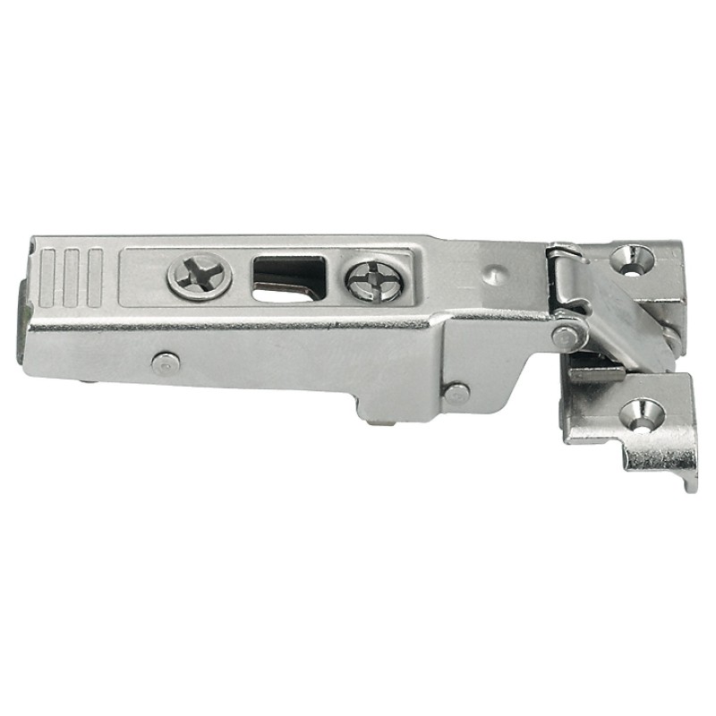 Blum Clip Top hængsel, specielt til alu-rammer med en åbning på 95 grader. Kræver speciel udfræsning i alurammer, hvorefter den monteres med 2 skruer.