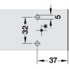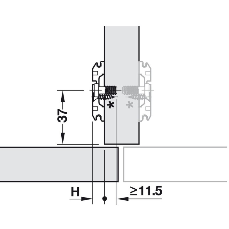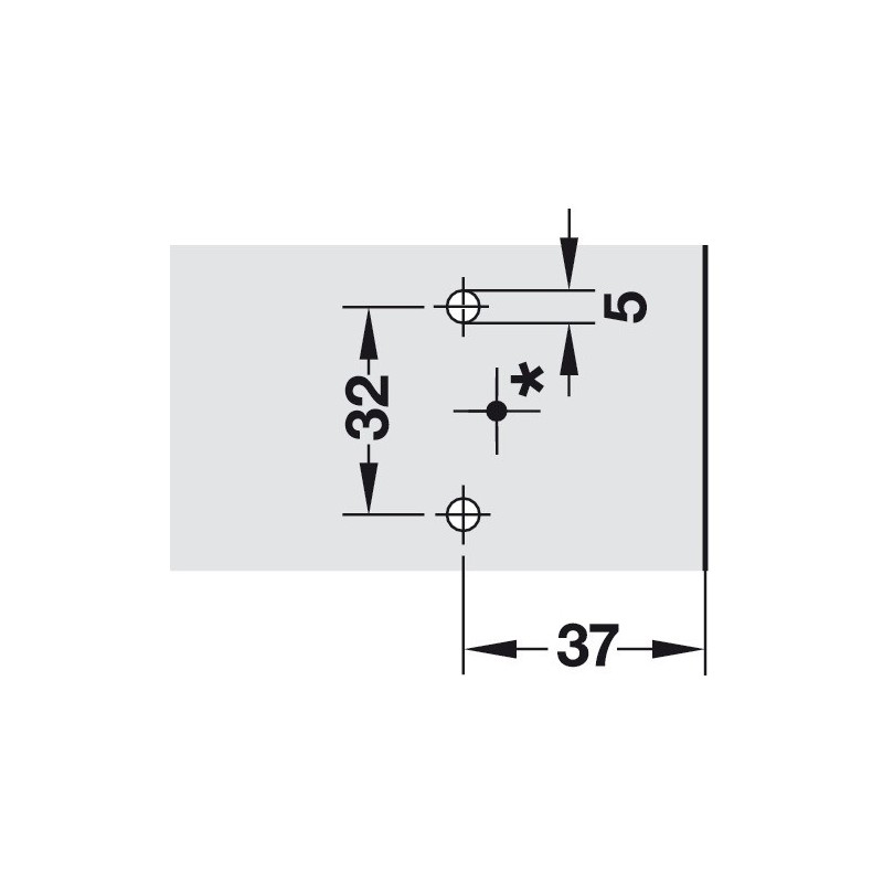 Afstanden du vælger længere nede afhænger af hængslet. Se hvilken afsted du skal vælge på produktsiden for hængslet. (Afstanden er blot højden på montagepladen der skubber hængslet længere ind i skabet)