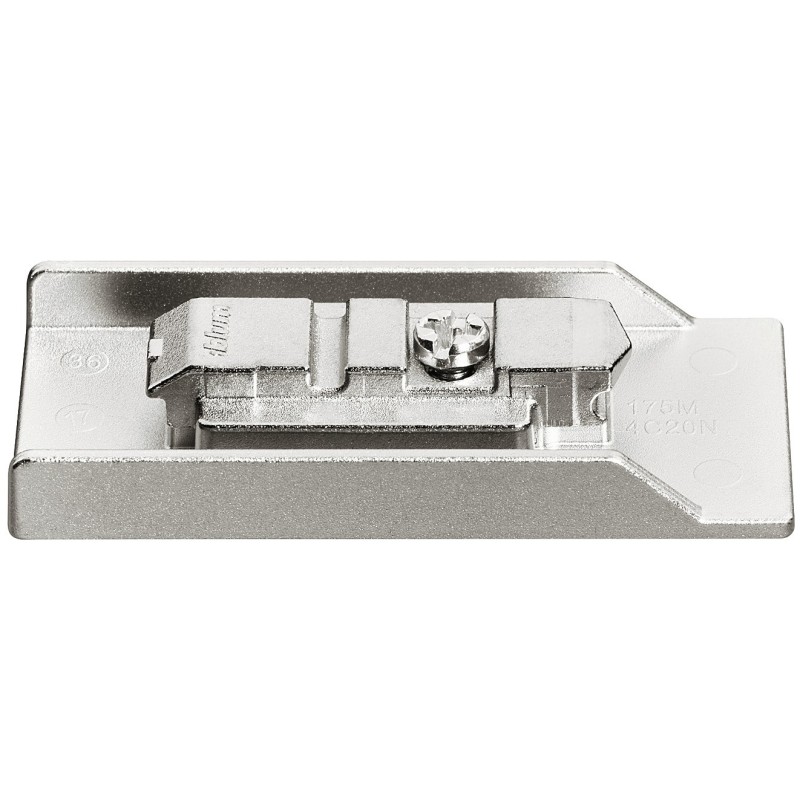 Blum montageplade til påklæbning. Denne montageplade er særlig egnet til glasvitriner og spejlskabe. Montagepladen klæbes på lågen og hængslet clipes fast til montagepladen.