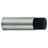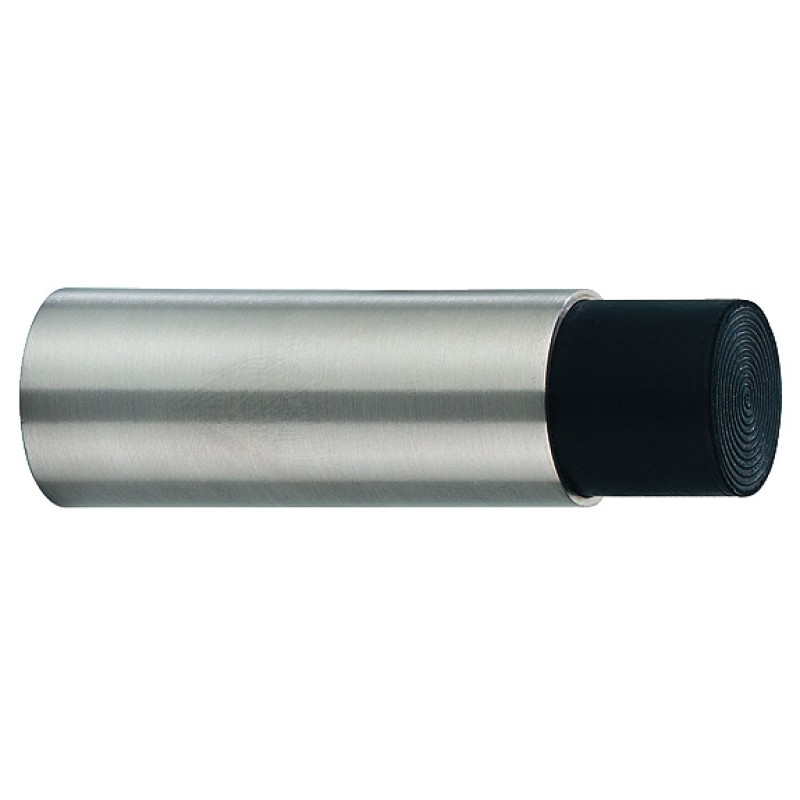 Enkel og klassisk dørstopper til montering på væg. Denne model er i rustfri stål, med en børstet overflade, og med sort beskyttelse for enden af dørstopperen.