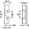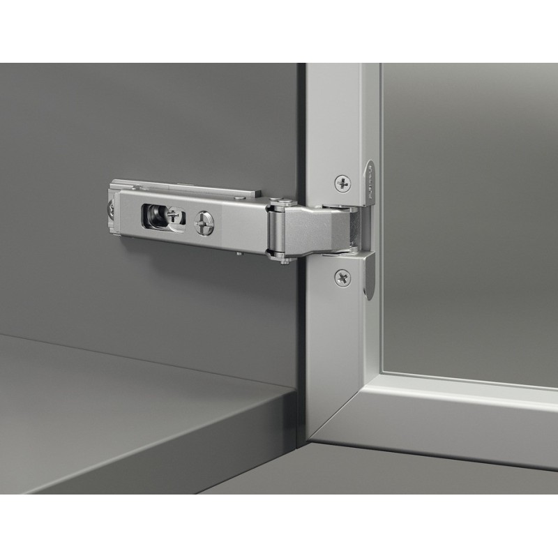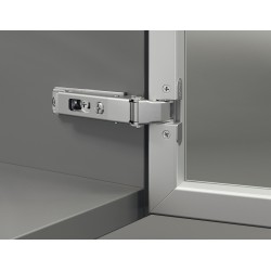 Häfele Duomatic med en åbning på 105 grader, til aluminiumrammer fra 17 til 24 mm bredde. Hængslet passer i et indhak i aluramme, og skrues fast.