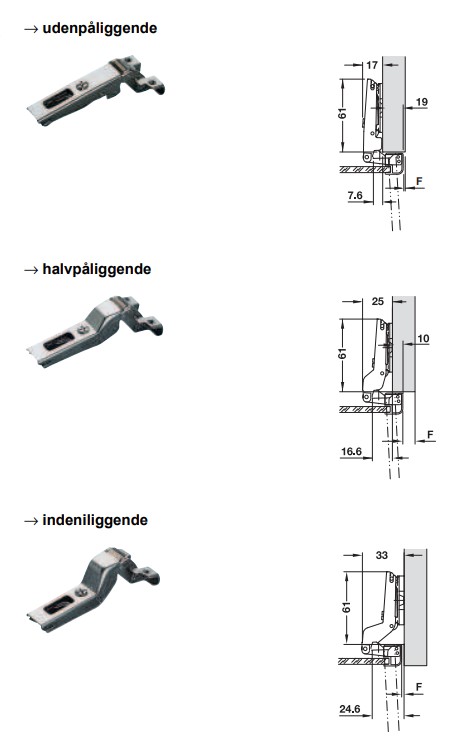 Du kan læse meget mere om hvordan du finder det rigtige type hængsel og hvordan du finder afstanden på din montageplade her: Vejledning i Duomatic hængsler