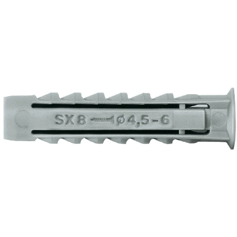 Fischer SX/SX-L dybel/rawplugs med krave i polymid. En kraftfuld dybel/rawplugs til montering og fastgørelse af forskellige emner. Denne model er med 4 sidet ekspansion som giver en god utolig høj bæreevne og sikker forankring i materialet. Ingen ekspansion i halsen, hvilket forhindrer beskadelse af materialets overflade.