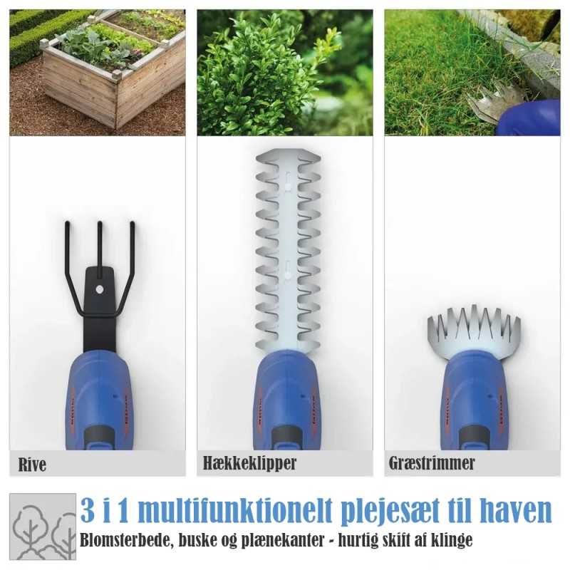 Klingen udskiftes nemt fra rive til hækkeklipper til trimmer og omvendt med easy-click system. Du skal derfor ikke til at finde andet værktøj frem for at komme videre med arbejdet.
