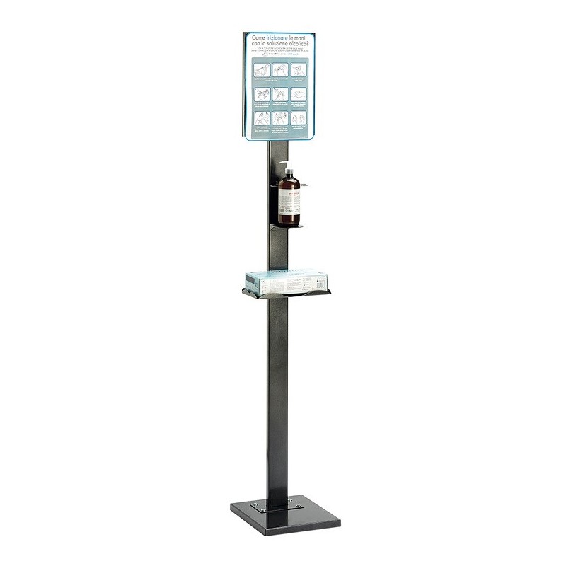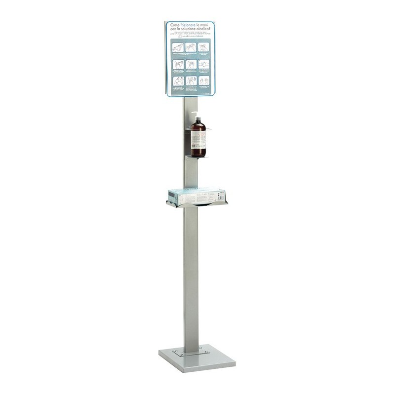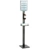 Simpel stander til placering af håndsprit med hylde og mulighed for placering af instruktioner i toppen. Oplaget til placering i entréer eller andre steder hvor mange fold går igennem.