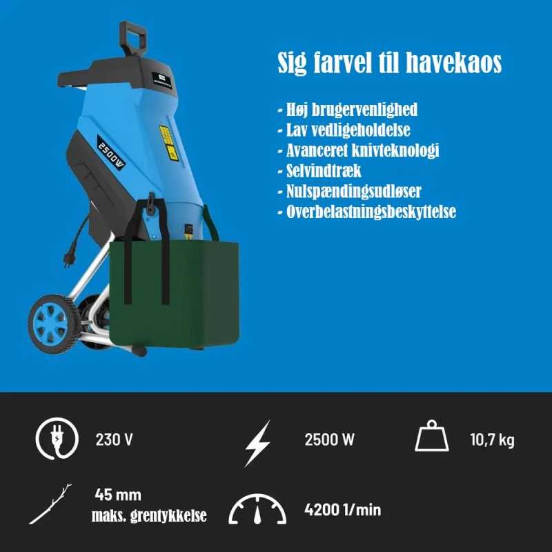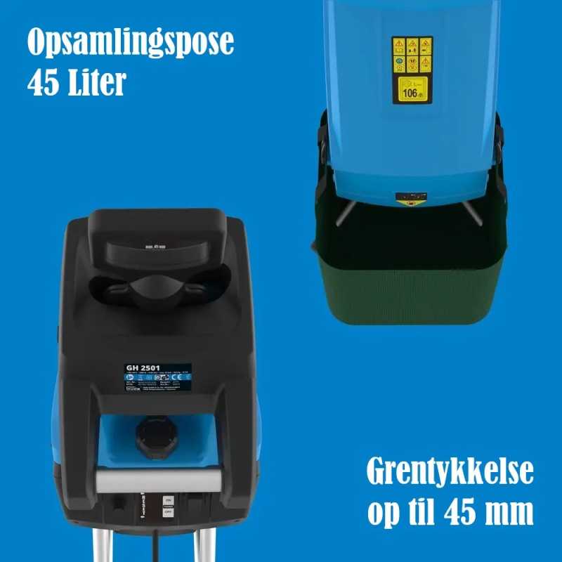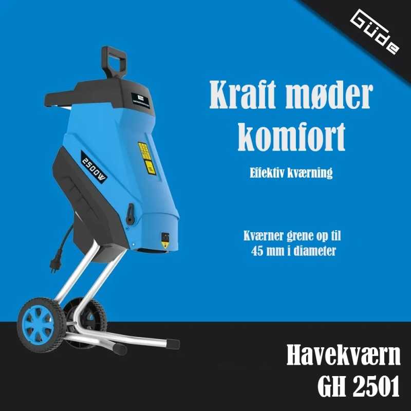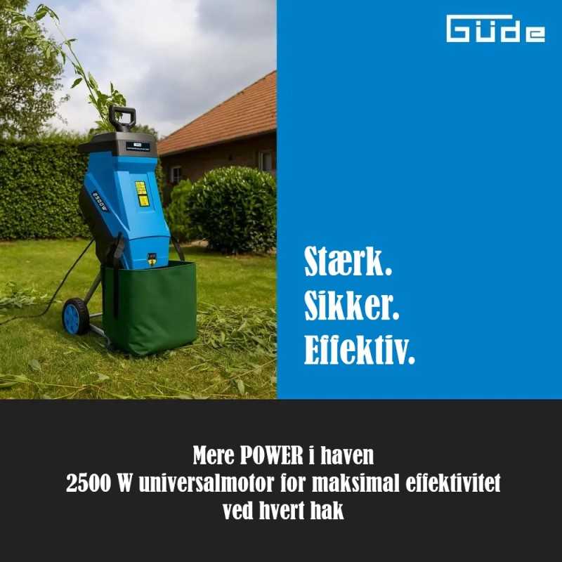 Güde GH 2501 er en kraftfuld all-rounder til haveaffaldet op til 45 mm grentykkelse. Kværnen har selvindtræk og avanceret klingeteknologi, som hjælper med at få has på det grønne affald uden problemer. Resterne hældes direkte i en 45 liters opsamler, som kan aftages, når det er tid til at kompostere.