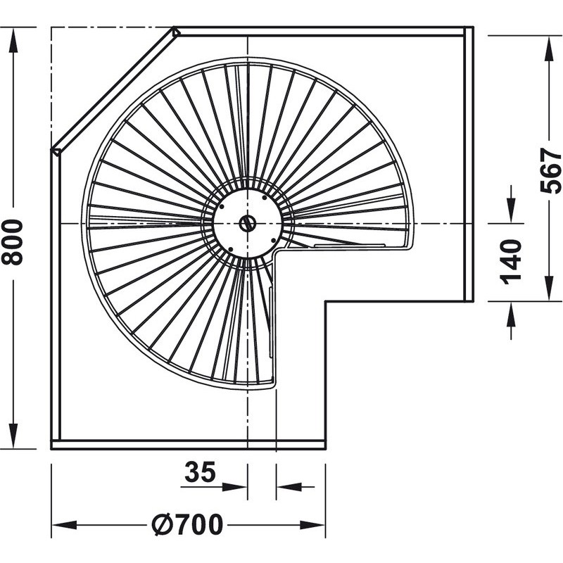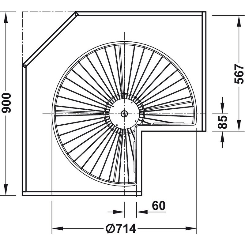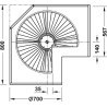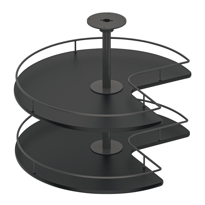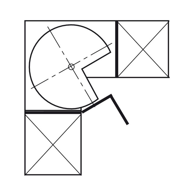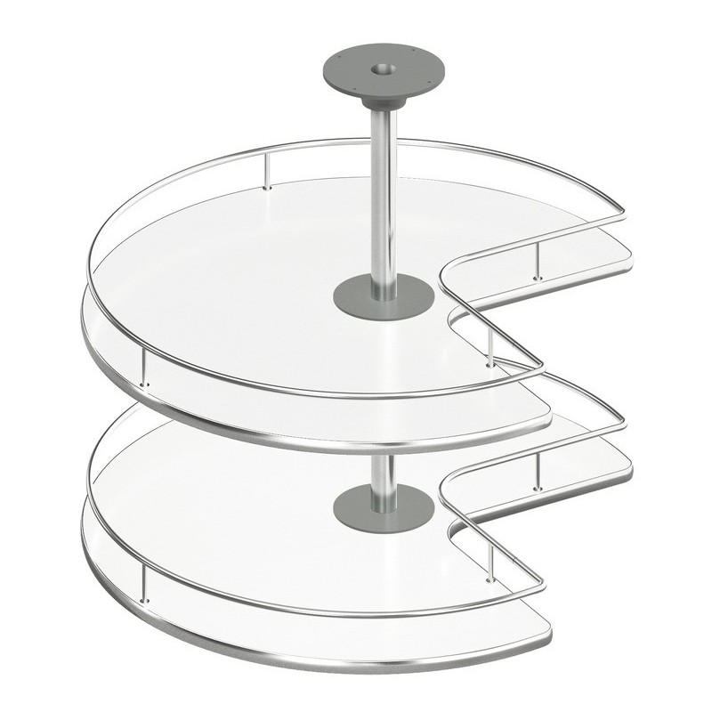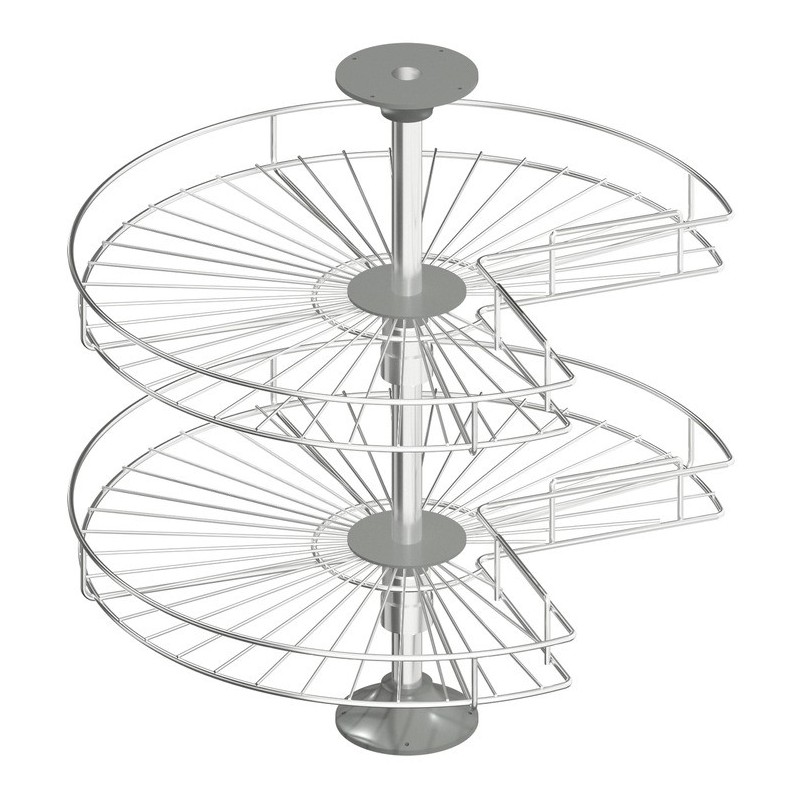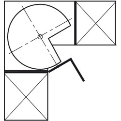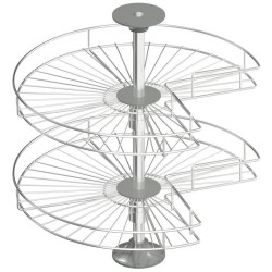 Systemet er oplagt til brug i hjørneskabet hvor pladsen er svær at udnytte, da denne model kan dreje 360 grader, så du har adgang til alle dine ting på hylderne. Denne model passer til 900 x 900 mm hjørneskab med påligggende låger.