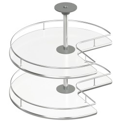 Smart og moderne drejebeslag med drejehylder til hjørneskabe. Modellen består af 2 trekvartcirkel drejehylder der drejer om en akse. Denne model fås med trådbund, eller med hylde i hvid eller sort