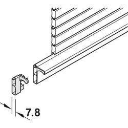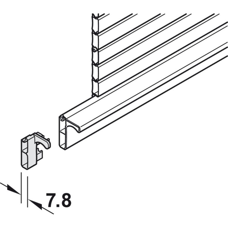 Gribelisteføring (I) til gribeliste. Gribelisteføringen sættes i ende af gribelisten og benyttes til at styre gribelisten i løbeskinnen.