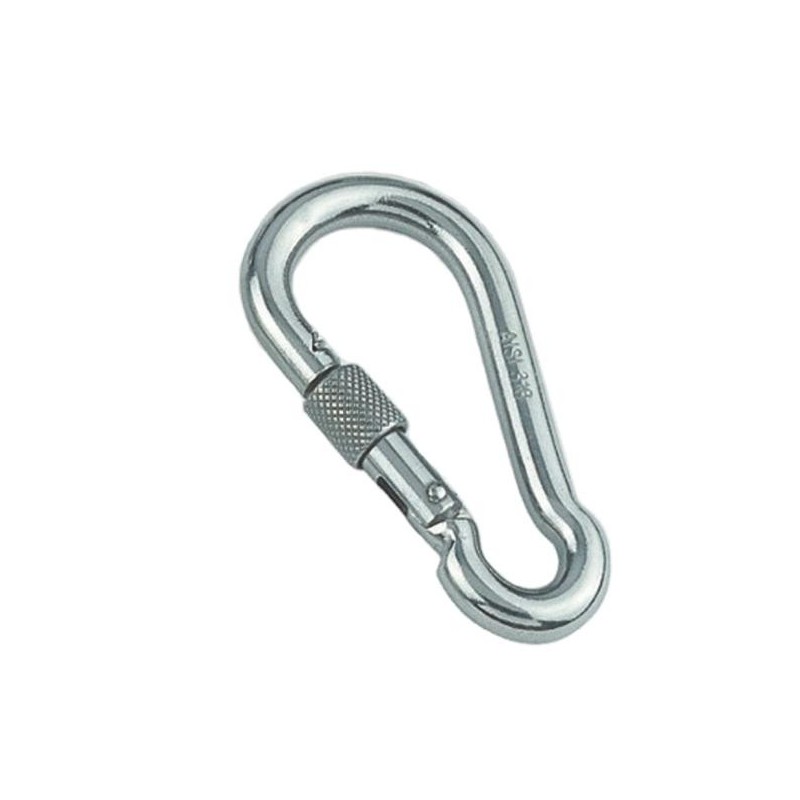 Karabinhage med lås i A4 syrefast rustfri stål, perfekt til brug på båd eller udendørs generelt.