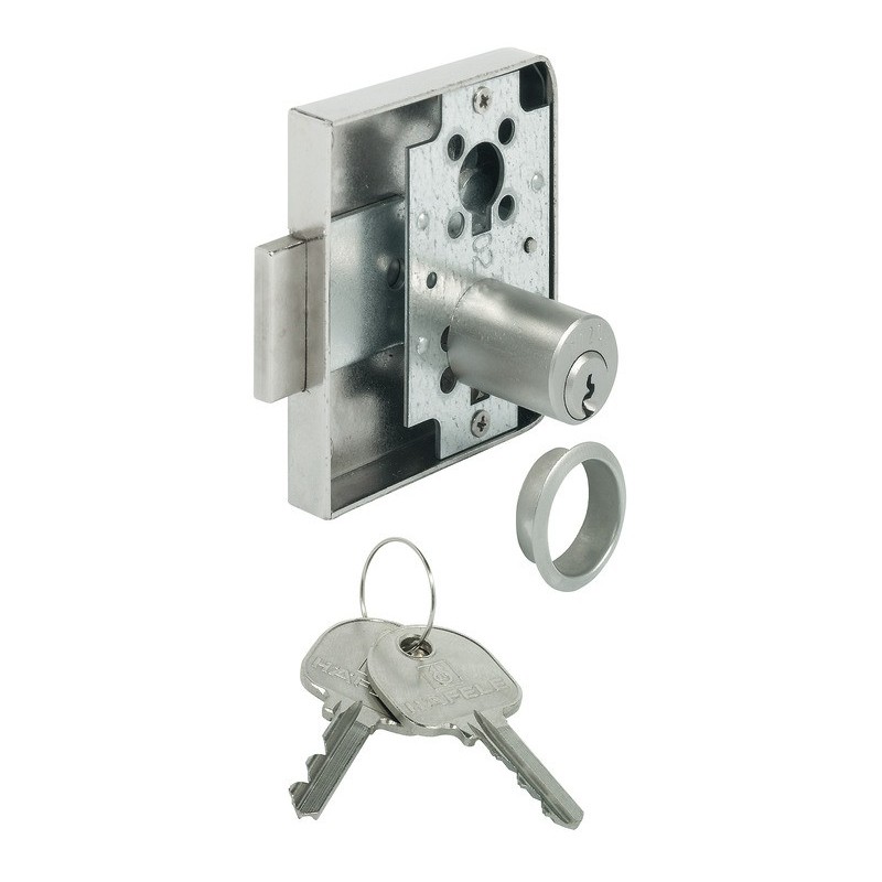 Påskrunings-rigellås med dødbolt og dornmål på 25 mm. Er lavet i stål med messing cylinder og forniklet overflade.