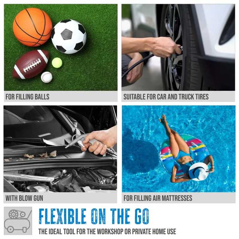 Kompressoren kommer med ventil adapterer til bolde, cykler og luftmadrasser. Alt i alt en praktisk løsning til on-the-go behovet.