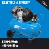 Kompressoren har en stor 50 L kedeltank, og kan nå et tryk på maks. 10 bar. Derudover, har den trykreducerende funktion, som gør det nemt at justere trykket. Der er også sikkerhedsventil og kondensdræn, samt modtryksventil og integreret luftfilter.