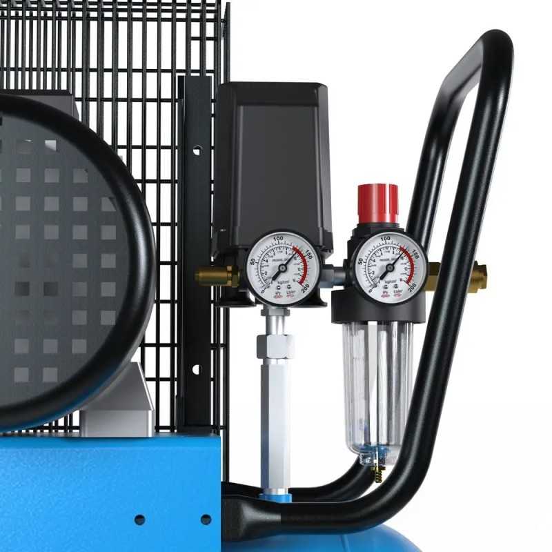 Trykluft kompressoren har integreret luftfilter og trykreduceringsenhed, samt en vandudskiller og kondensdræn. Der er også sikkerhedsventil, modtryksventil og 2 luft koblinger. Der er trykmåler både til kedelpresset og arbejdspresset, samt overbelastningsbeskyttelse og efterkøling.