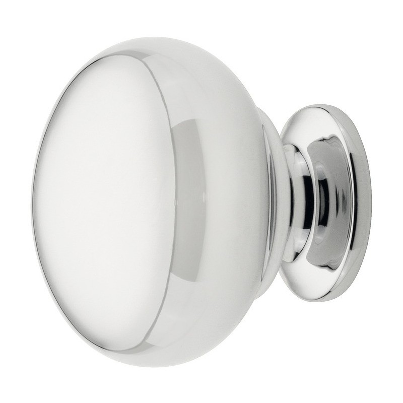 Traditionel rund møbelknopgreb i forkromet poleret messing. Grebet har et helt enkelt og klassisk design som passer godt alle slags skuffer og låger.