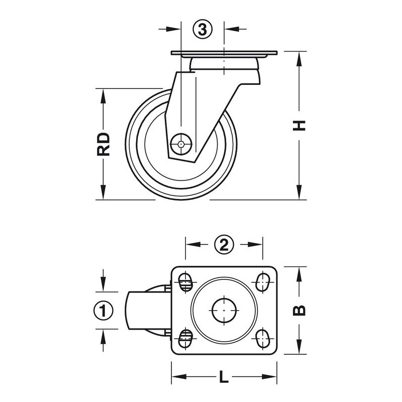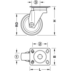 | Mål (L x B) mm | Hulafstand | Hjul Ø RD mm | Hjulbredde mm | Byggehøjde H mm | Bæreevne kg | Afstand mm |
