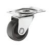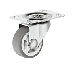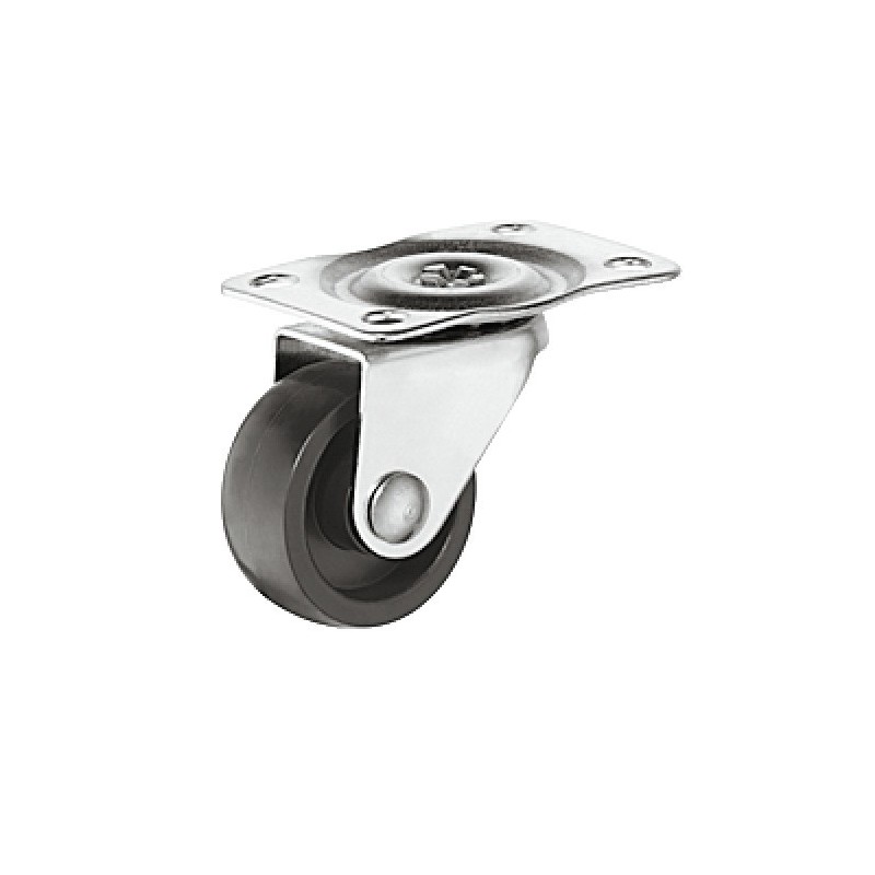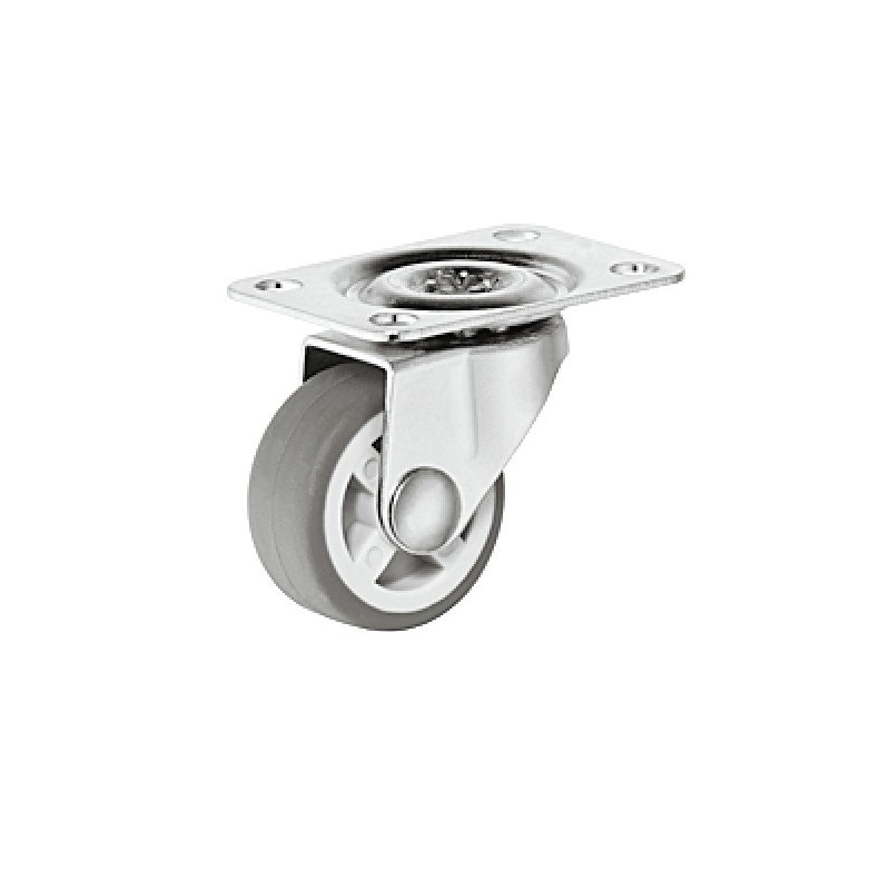 Lækkert styrbar redskabshjul i sort eller grå kunststof med et hus forzinket stål. Denne model er med montageplade og har et enkelt kugleleje i drejekransen.