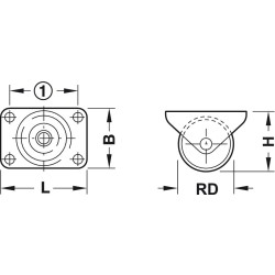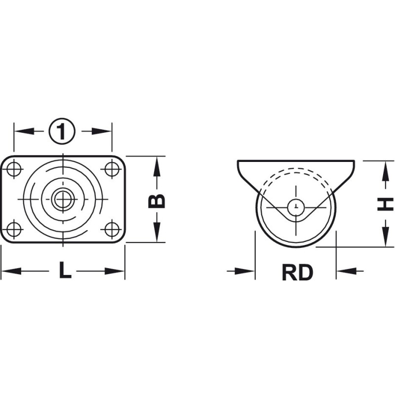 Mål (L x B) mm Hulafstand Hjul Ø RD mm Hjulbredde mm Byggehøjde H mm Bæreevne kg Løbeflade