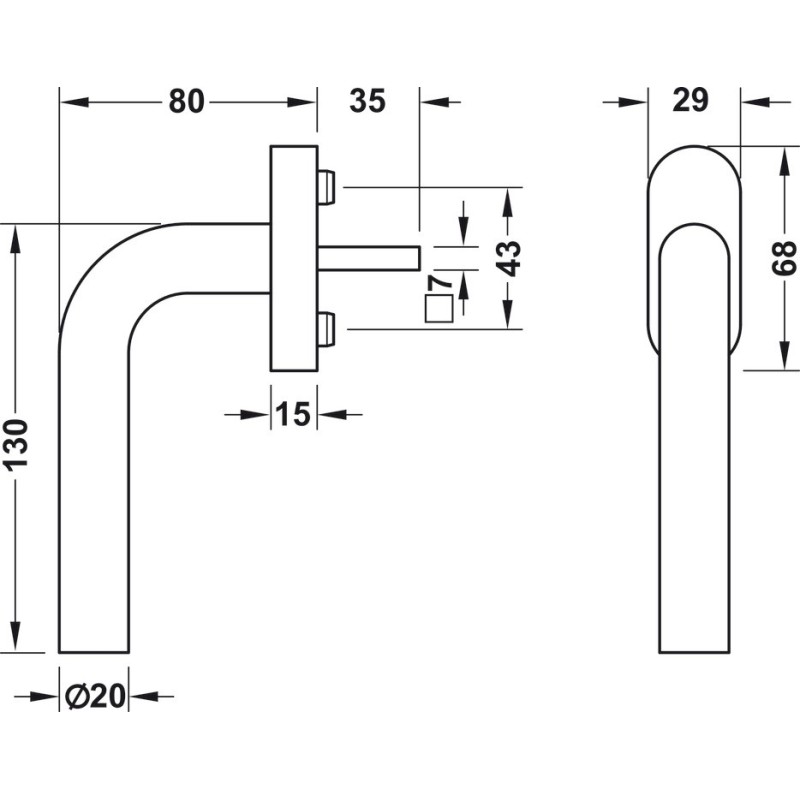 Vinduesgrebet har rastestilling på 90° med kuglelejemekanisme til vinduer, der kan tilte, samt en firkantet monterings stift på 7x7 mm.