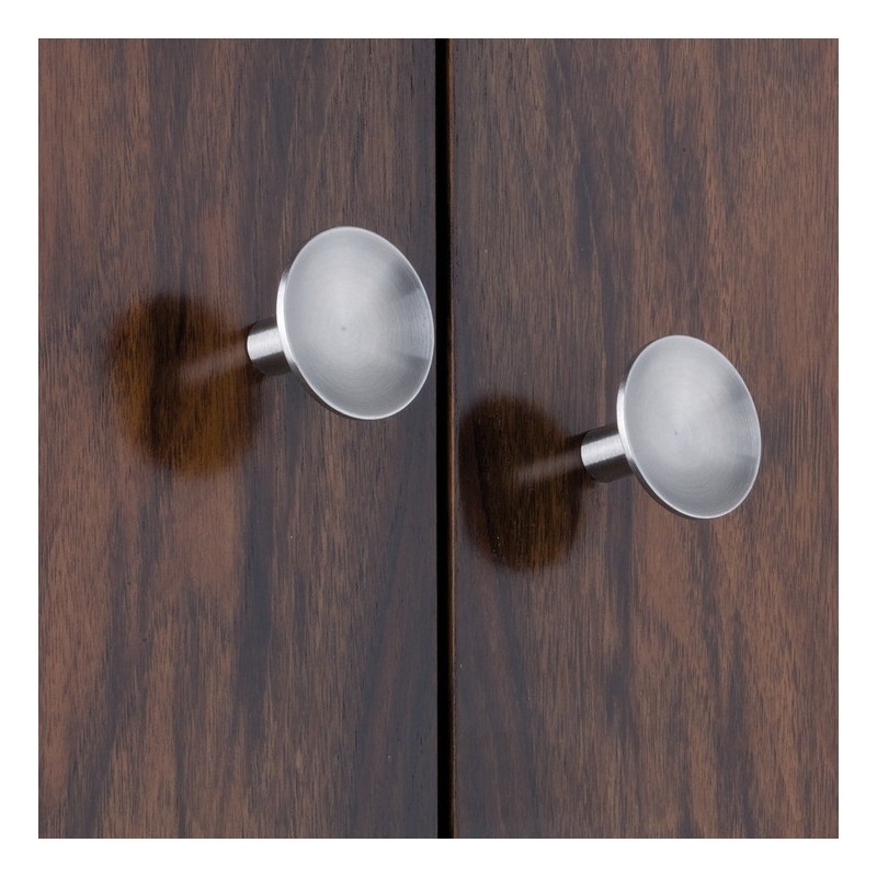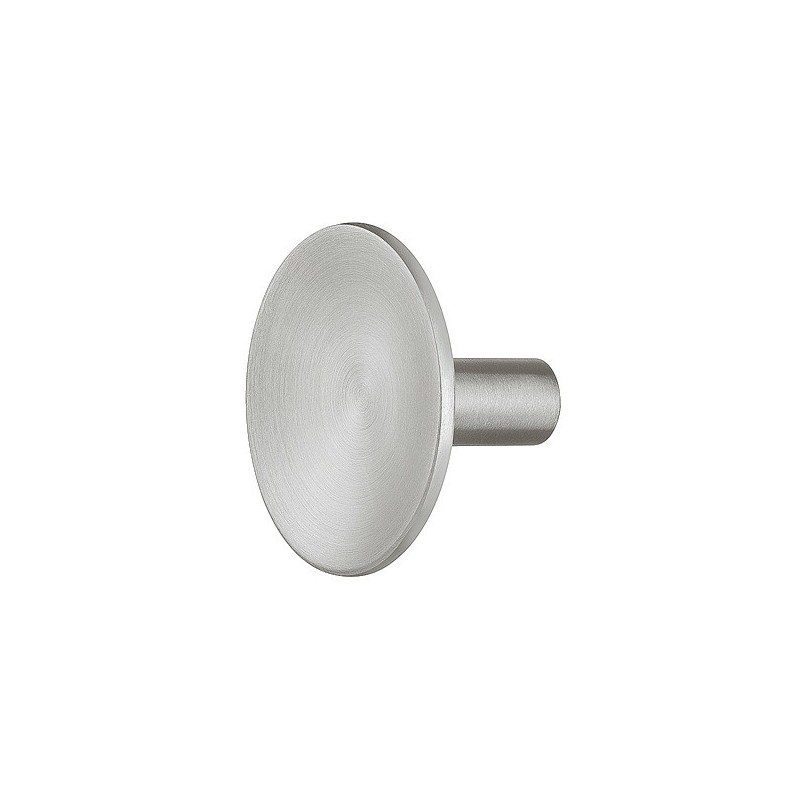 Flot rund knopgreb med stort fladt hoved. Knopgrebet er produceret i rustfrit stål og har en mat børstet overflade.