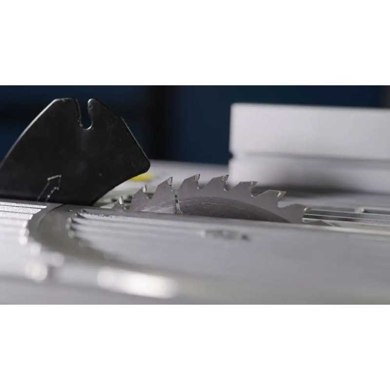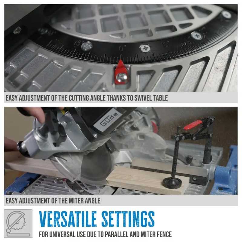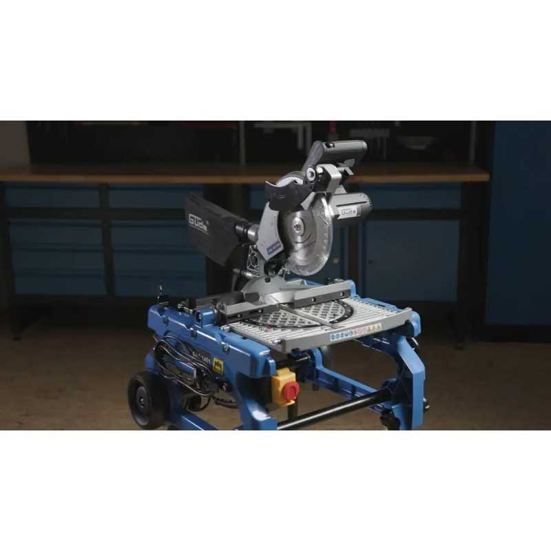 Bord med kap-/geringssav fra Güde. Saven har flip-over funktion, som tillader dig at skifte mellem tværsnit og bordsavs funktionerne nemt og hurtigt. med præcisionslaser og klemme til fastgørelse af projektet. Denne er ideel til krævende savarbejde.