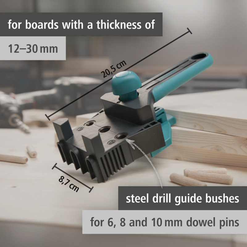 Perfekte dyvel samlinger helt fra star, helt uden behov for ekspertviden. Dowelmaster gør det nemt at bore ud til præcise og snorlige hjørnesamlinger, længdesamlinger m.m. uden problemer ved hjælp af det justerbare stop, to centrerings bolte og tre intergrerede boreguides.