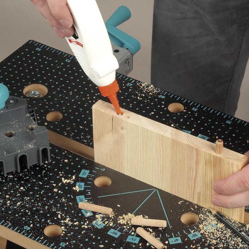 Dowelmaster kan nemt bruges til flere former for samlinger. For overfladesamlinger skal du blot justere borestoppet til pladens tykkelse og dyvellængde. Placér Dowelmasteren på pladen, hvor den skal sikret med de to tilhørende centreringsbolte. Med borelæren på plads kan du nu bore præcis i midten af overfladen. Længdesamlinger er også ligetil – klem pladen på arbejdsbordet og put Dowelmasteren med et guide punkt over den indsatte dyvel i det første bræt, og bor gennem bøsningen.