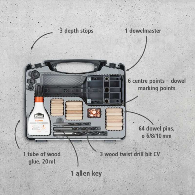 Har du allerede det hele men mangler en dowelmaster? Så se tilbehør, hvor den kan findes enkeltvis.