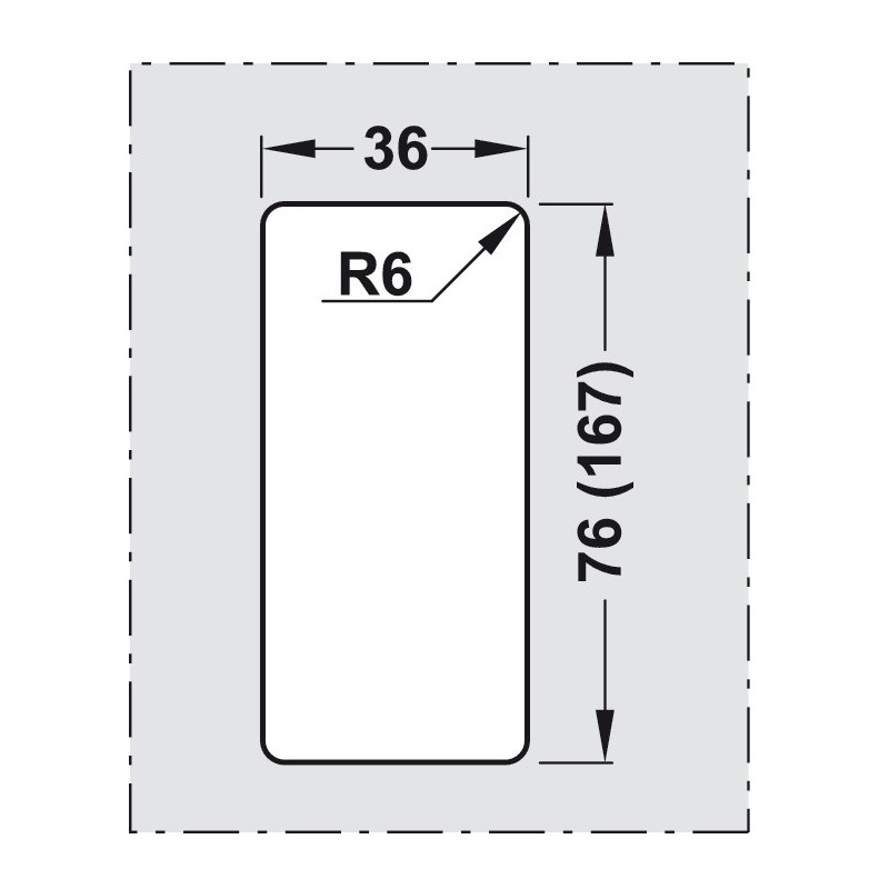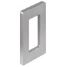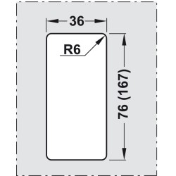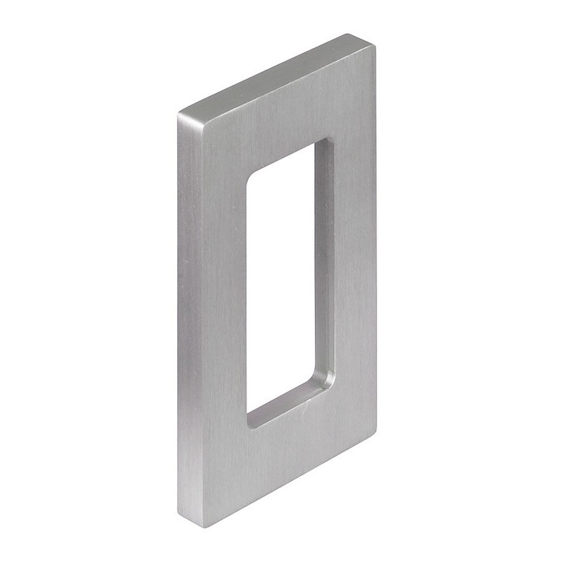 Regtangulær skålegreb i aluminium med en stålfarvet overflade. Denne model har hul i midten og er beregnet til montage på en glasdør. Grebet monteres direkte på døren med det dobbeltklæbende tape eller lim.