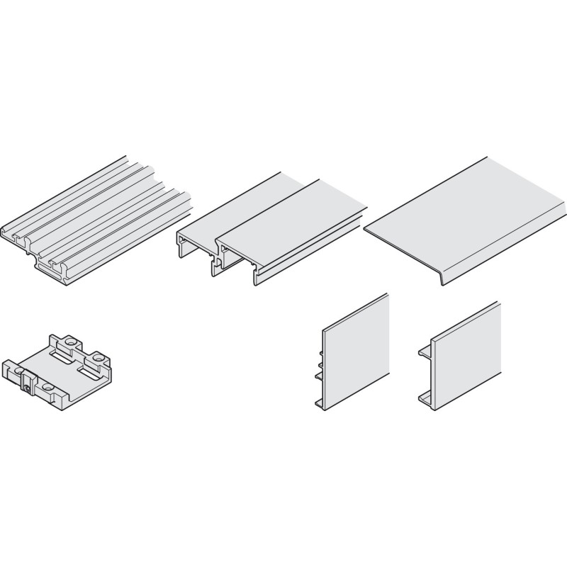 Sæt til Hawa Combino 65 H VF ol og 80 H VF ol skydeskabsbeslag. Indeholder både styre- og løbeskinne samt afdækningsprofiler til en flot finish.