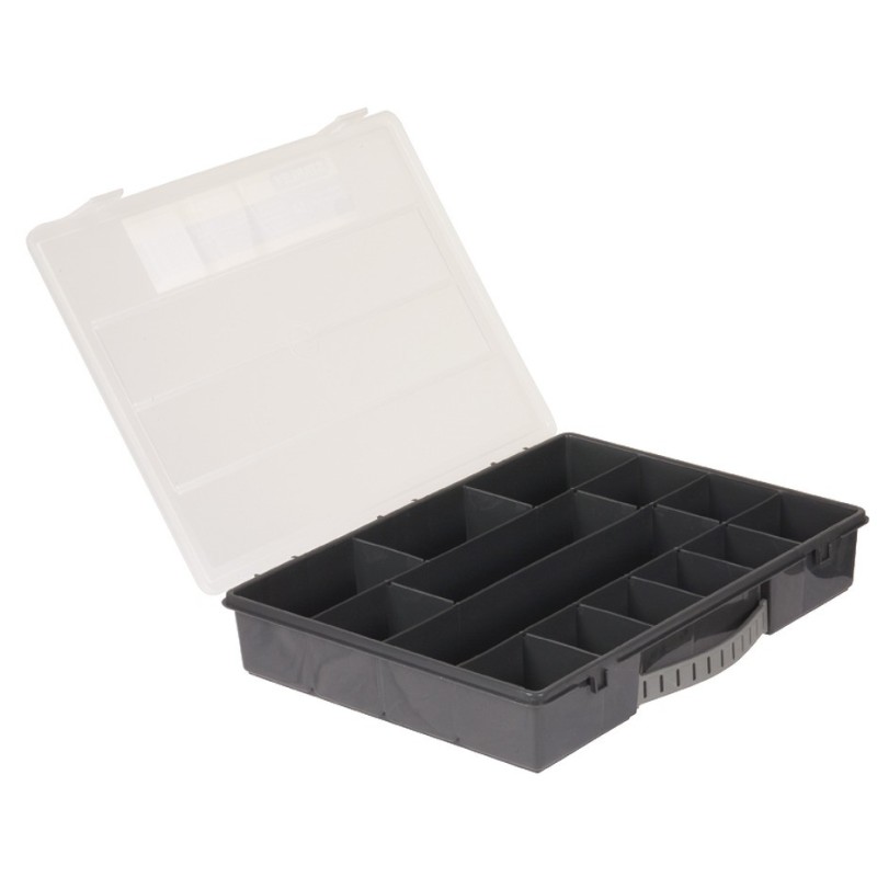Sortimentskasse med 14 rum. Velegnet til alle de små skruer, søm og diverse andet småtteri, som hurtigt triller væk.