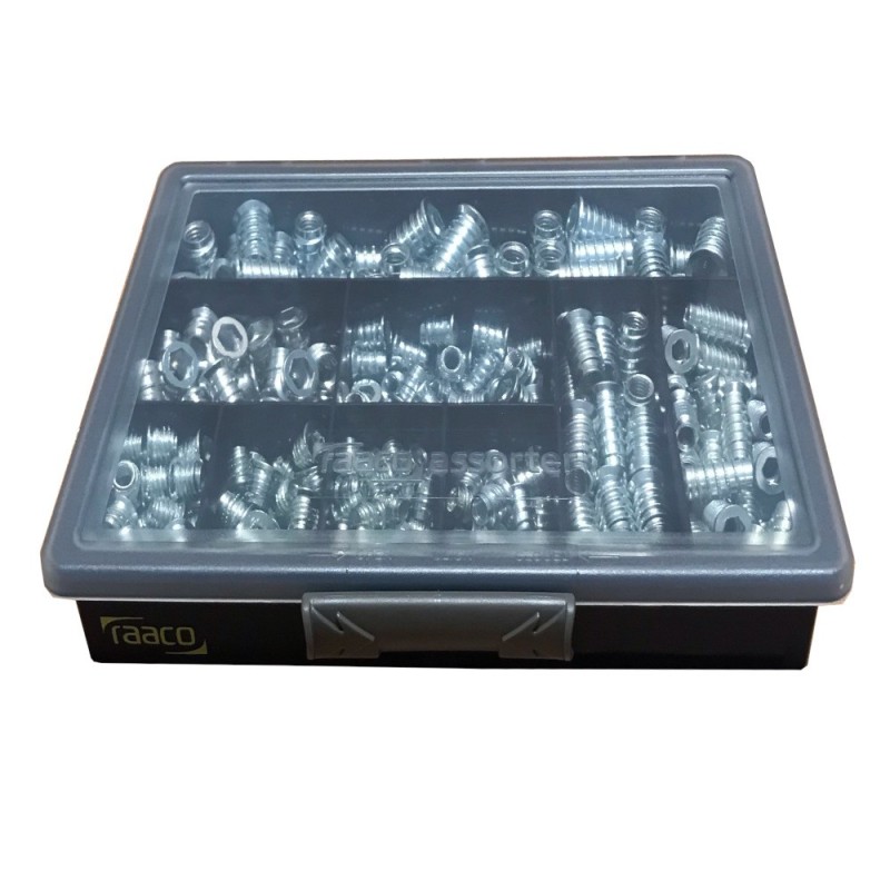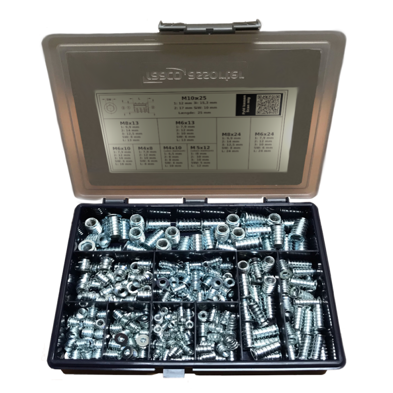 Sortimentskasse med 345 bøsninger til iskruning i 9 forskellige størrelser.