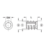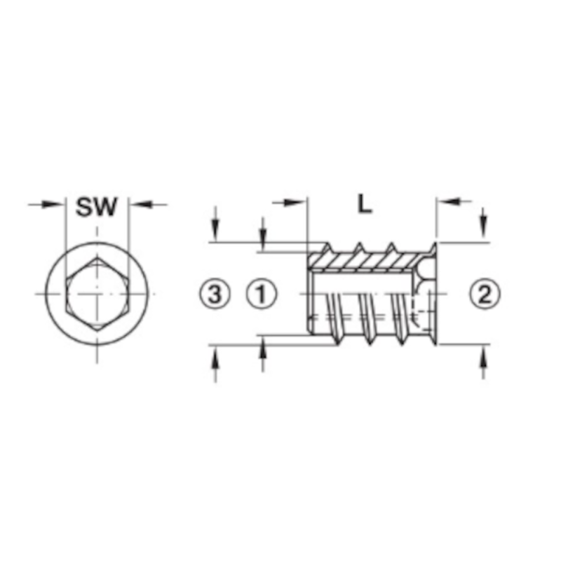 | Gevind | Gevindlængde (L) | Inderste diameter (1) | Ydre diameter (3) | Diameter på dækkant (2) | Gevind diameter (SW) | Antal i kassen | |