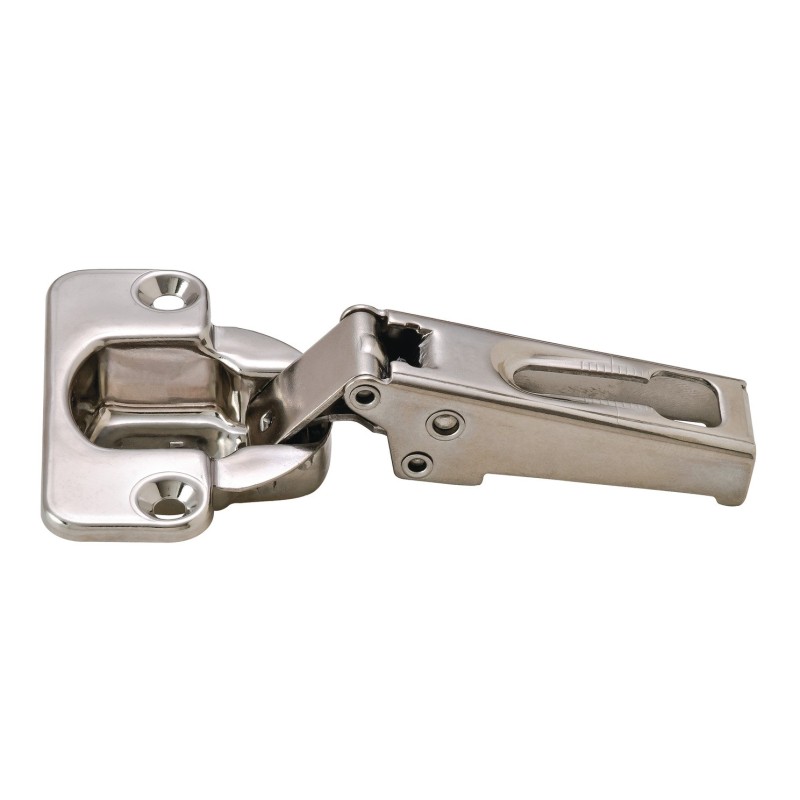 Kophængsel i rustfri stål med en åbning på 100 grader. Dette er et standard hængsel i rustfri stål til anvendelse i køkkenlåger og generelle opbevaringsskabe i hjemmet.
