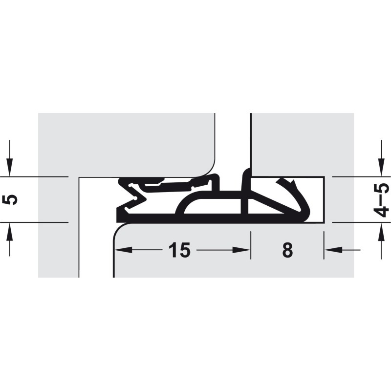 Tætningsliste til hoveddøre. Lavet i termoplastisk elastomer (TPE) og passer til falsede døre med en falsningsbredde på 15 mm.