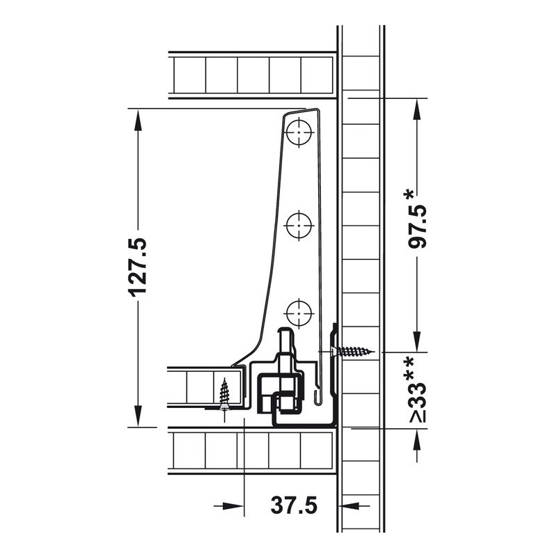 ** Ved korpusskinne Tip-On Blumotion 36 mm, med synkroneringsstang direkte over korpusbundplade eller travers 39 mm.