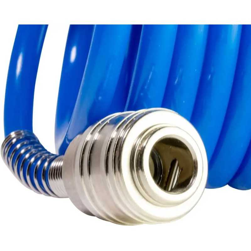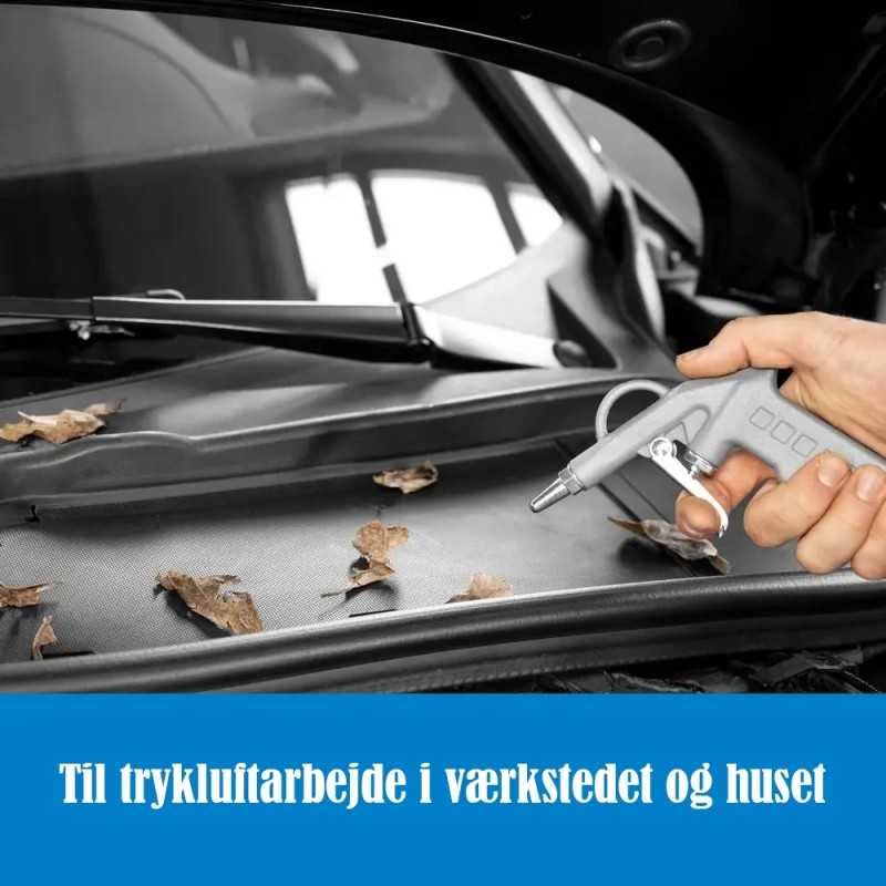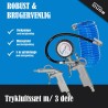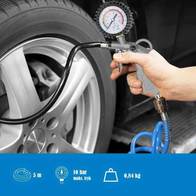 Sættet kommer med en dækpumpe med integreret manometer, blæsepistol med stiknippel og 5m spiral slange med stiknippel.