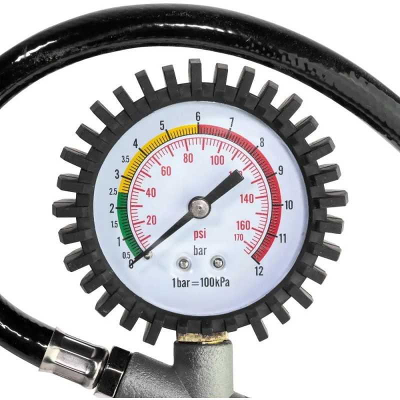 Dækpumpen har et stort manometer med gummikant, som gør det nemt at aflæse trykket, samt kvalitets håndtag af aluminium. Blæsepistolen har ligeledes aluminiums håndtag.