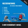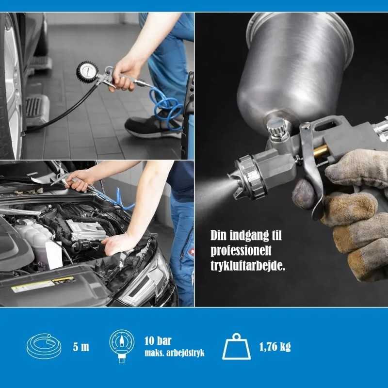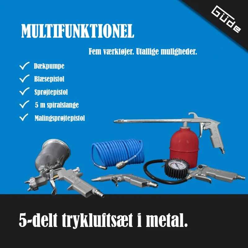 Kæmpe lufttrykpistol sæt fra Güde med 5 dele; malersprøjte, blæsepistol, 5 m slange, dækpumpe med manometer og spøjtepistol med stål beholder.